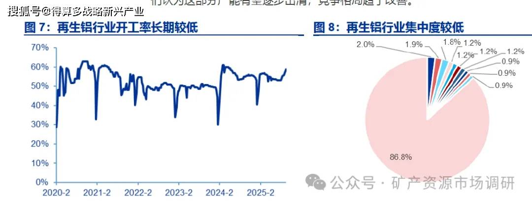 废铝构成再生铝的主要生产成本,占比约 9成。据上海有色网数据,以2025年9月平均数据计算,在再生铝生产的总成本中,废铝成本占比最高,约占总生产成本的 89.8%占比接近 9成,除废铝成本外,硅成本、铜成本、天然气成本及其余成本分别占比 2.4%3.3%、1.3%、3.1%。在废铝熔炼过程中,生铝(铝含量低于 98%,多来自废铝回收)与熟铝(铝含量高于 98%,多来自使用氧化铝生产的原铝)的使用比例对成本构成直接影响企业通常根据 ADC12 铝合金(再生铝)与 A00 铝锭(原铝)的市场价差灵活调整配比-一当 ADC12 铝合金价格高于 A00 铝锭时,成本优化驱动熟铝比例逐步提升,反之亦然。此外,根据生熟铝实际使用比例,需额外调整硅和铜的比例,平均来看硅含量约 9.6-12%,铜含量约 1.5-3.5%,会根据实际生产牌号和客户需求变动。