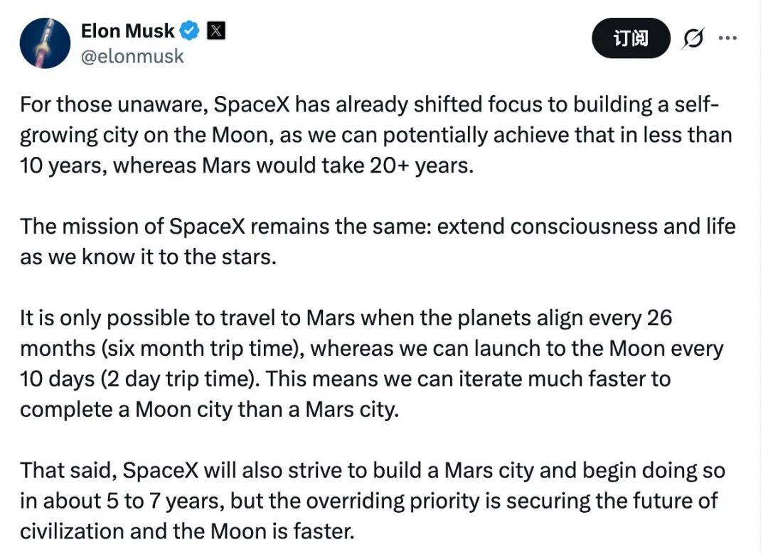 SpaceX 已经将重点转向在月球上建造一个自给自足的城市,因为我们可能不到 10 年就能实现,而火星则需要 20 多年。
