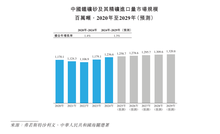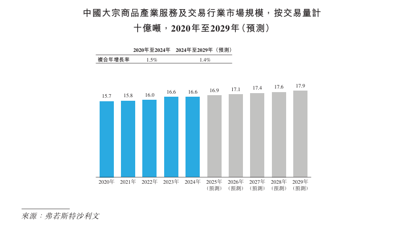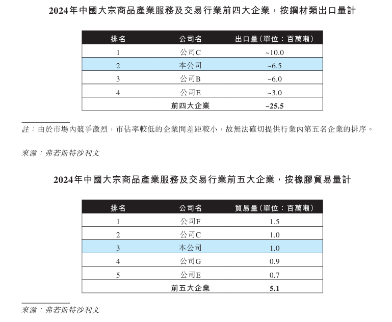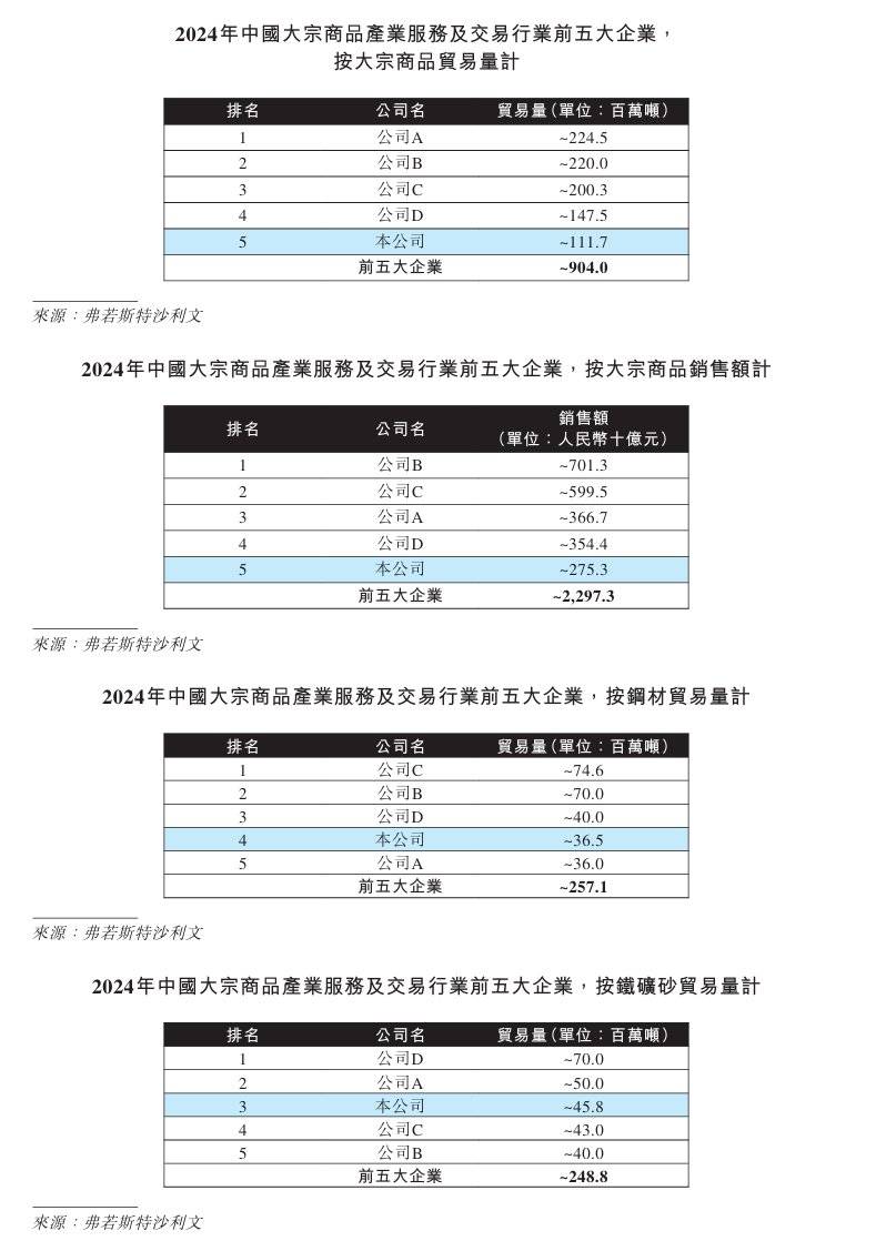 根据弗若斯特沙利文的资料,按2024年贸易量计,公司是中国第五大大宗商品产业服务商及交易商;是中国第四大钢材类产业服务商及交易商,同时是中国第二大钢材类出口产业服务商及交易商;还是中国第三大铁矿砂类产业服务商及交易商; 以及是中国第三大橡胶类产业服务商及交易商。