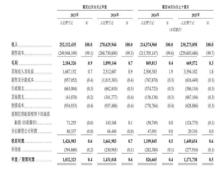 于2023年、2024年、2025年截至10月31日止十个月,热联集团年度/期间利润分别约为10.32亿元、14.31亿元、11.72亿元人民币。