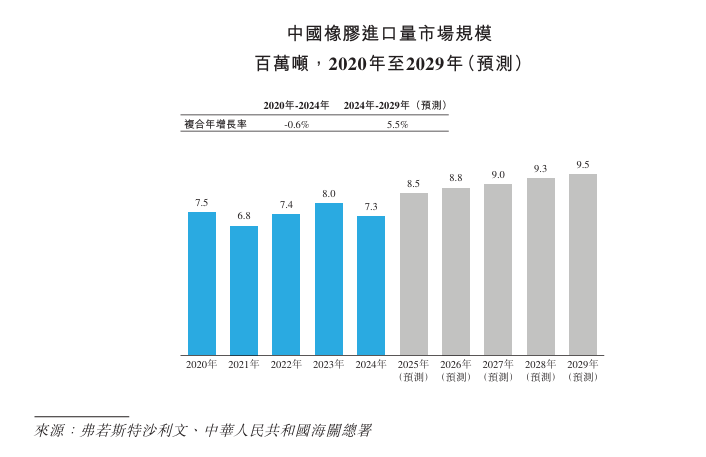 由于下业的需求降温以及海外供应缩减影响,2020年至2024年中国橡胶进口量出现了小幅波动。展望未来,新能源汽车产业的发展有望带动高性能轮胎的需求,预计中国的橡胶进口量将呈持续上升趋势。