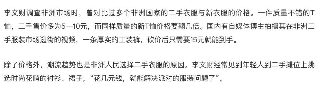 有网友询问当地的居民,一件标着“开化人民医院”的衣服在非洲菜市场可以卖到15块,这对于日薪十几块的非洲人来说是可以承担的。中国二手服装不但便宜而且干净,在非洲的确很受欢迎。