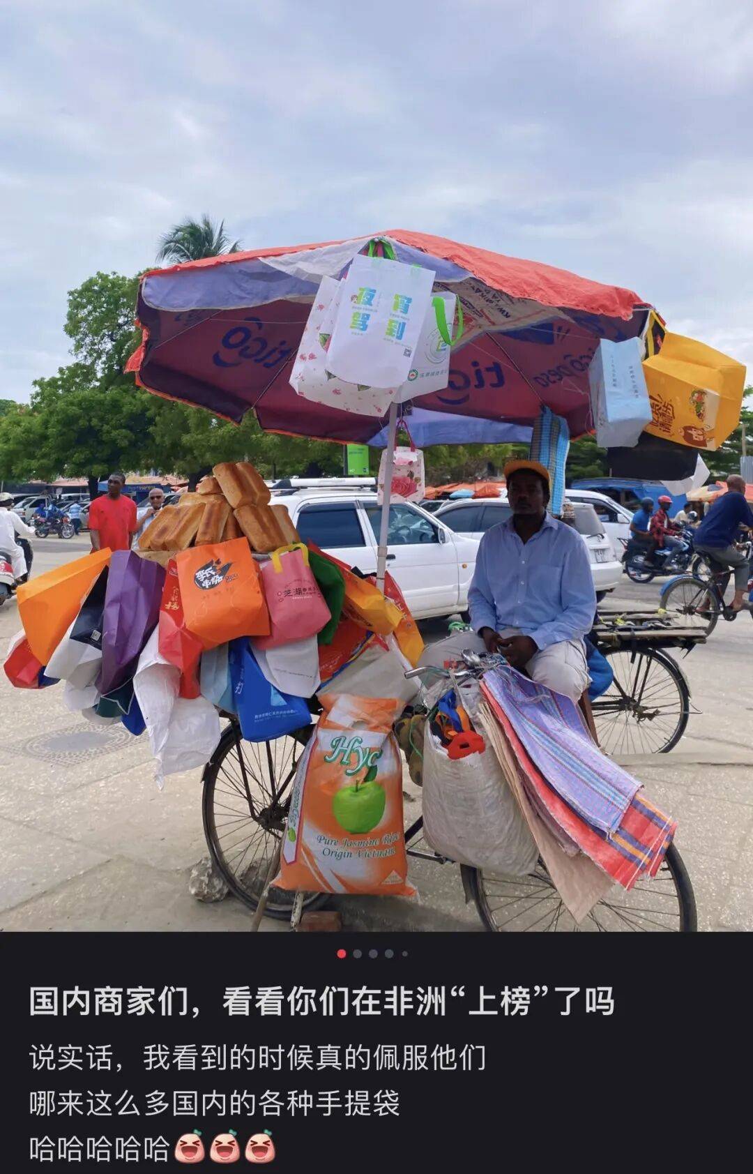 最近这两年,有不少去非洲工作或旅游的国人发现了一个有意思的现象——在很多非洲国家的菜市场、街边摊上,总能看到一些熟悉的“中国元素”——比如印着“外卖来了”,或是各种奶茶品牌的保温袋子。这些袋子被摊主挂在最显眼的位置,和非洲人民的日常用品摆在一起出售。